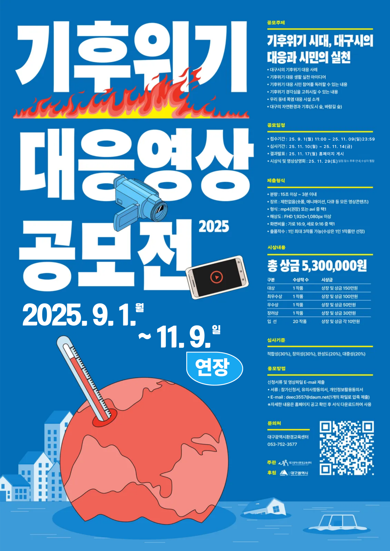 대구광역시환경교육센터에서는 전 국민을 대상으로 기후위기 대응과 환경재난 인식 제고를 위한 「2025년 기후위기 대응 영상 공모전」을 진행하고 있습니다. 여러분의 관심과 참여에 힘입어, 보다 많은 분들의 참여를 위해 공모 기간을 다음과 같이 연장합니다.