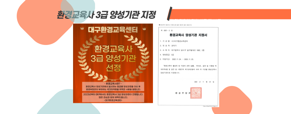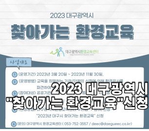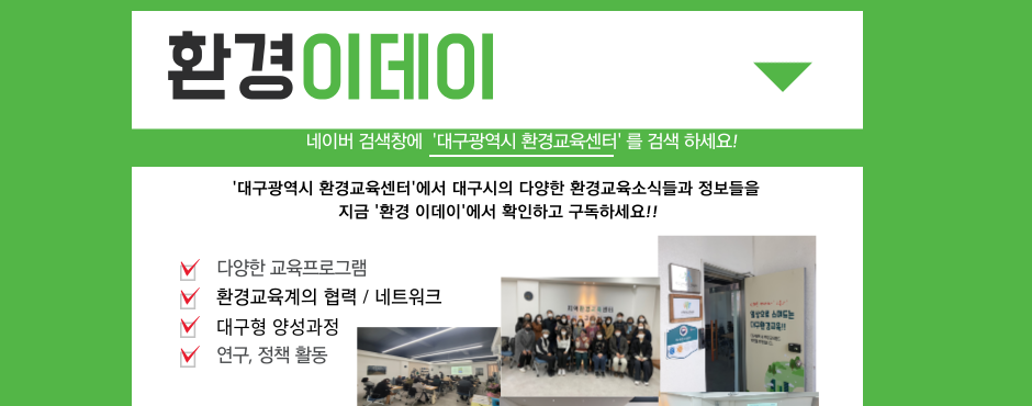 환경이데이 2023년 2월 발행일.2023. 02. 28 발행처.대구광역시환경교육센터 홈페이지 바로가기 주소 : 대구시 남구 현충로 64, 1층 (42452) TEL : 053-752-3557 FAX : 053-753-3557 E-mail : deec@daegueec.co.kr Copyright © 2022. Daegu Environment-Education-DAY All rights reserved.