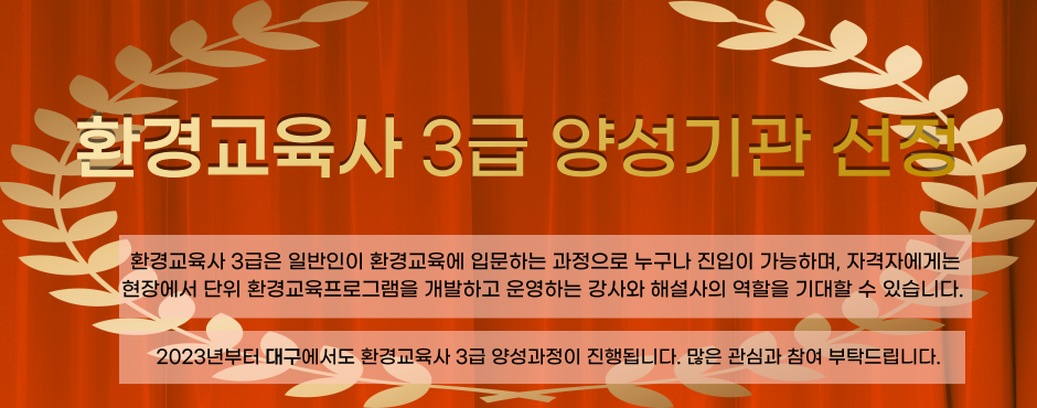 NEWS 독수리와 공존한 시간, 2026년 고령 독수리 식당 이야기 [환경교육이슈] 빅히스토리와 환경교육 지구시민을 기르는 교육의 전환 [용학도서관] ‘기후환경교육 우수도서관’ 으로 선정되었습니다. 대구광역시 제4차 환경교육계획 수립 수성어린이건축조경문화학교, '도시 속 새들의 집을 짓다' [대구생명의숲] 시민과학자와 함께 하는 동화천 생물다양성 조사